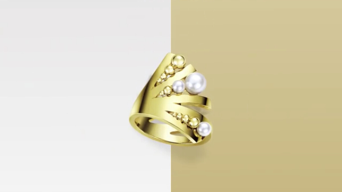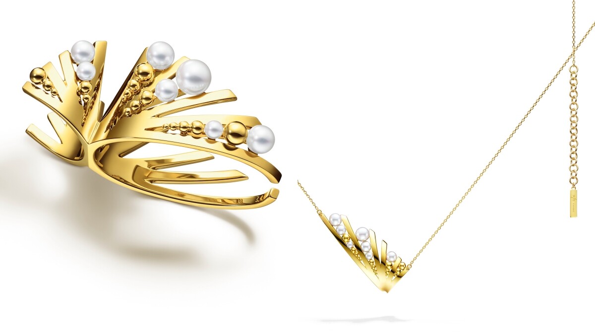 充滿動感的放射狀切割設計,上頭裝點著大小不一、交錯點綴的珍珠與黃金珠,使整體顯得柔和輕盈,並淡化了黃K金在視覺呈現上的厚重感,立體的麥穗形廓無論在何種角度都散發著極致時髦品味。