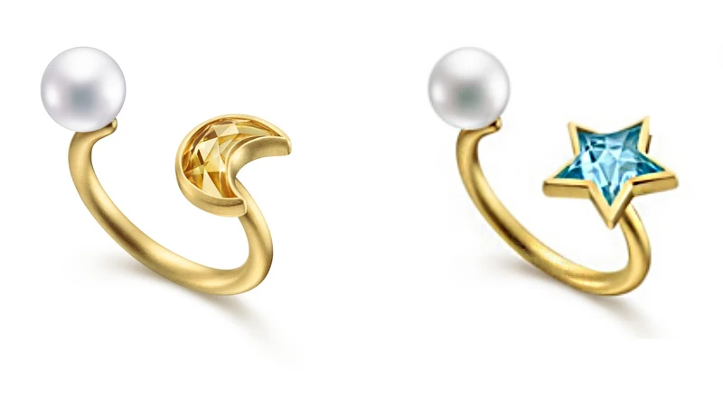 將月亮和星星照亮夜空設為創作主題,分別以黃色綠柱石表達月亮的平靜柔和、藍色的拓帕石則閃耀著星星閃閃動人的光芒,兩者除了替珍珠增添艷麗丰姿,也同時與珍珠的溫潤光輝呼應著,彷彿是用色彩演繹著宇宙之美的指間設計。