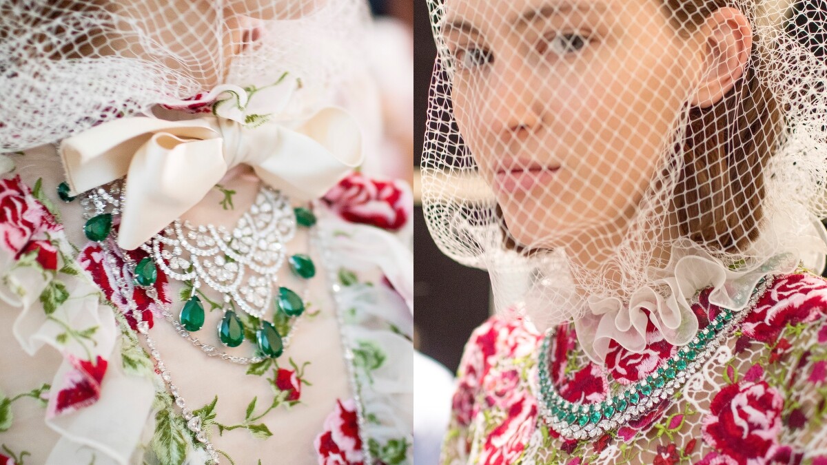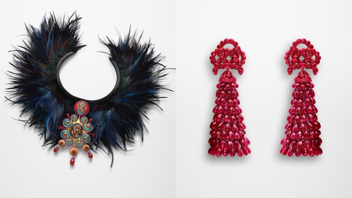 另一款汲取自蒙古草原民族服裝和傳統工藝的頸鍊,有著絢麗的寶石裝飾和民俗圖騰,而鑲飾於周圍的羽毛則是由羽毛藝術家Nelly Saunier共同創作。此外,紅寶石流蘇項鏈則傾訴著Caroline Scheufele的東方之夢,輕墜於頸間的流暢線形隨著律動飄擺出濃厚的異國韻味。