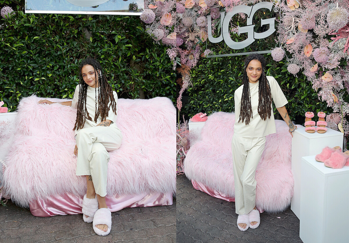 很多女生都愛粉紅色,但要能駕馭粉紅色也需要些技巧, Sasha Lane在現場就實力演繹出怎麼穿出不甜膩過頭的最佳示範:以一身純白的休閒褲裝,踩上本季最燒的粉紅毛毛織帶拖鞋,看起來俏皮又青春活力!