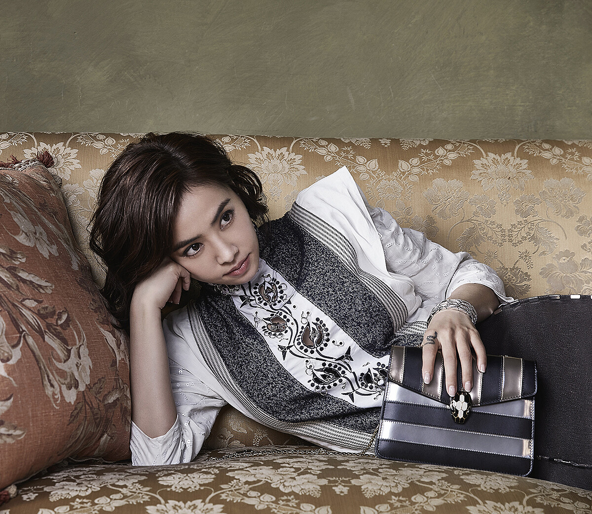 以炫銀搭配散發復古金屬光澤的古銅色小牛皮和黑色小牛皮拼接而成的條紋圖樣,裝飾上蛇眼鑲飾黑縞瑪瑙的黑白色琺瑯蛇頭扣環,寶格麗經典包款的華麗搖滾時尚魅力,讓百變天后也愛不釋手。