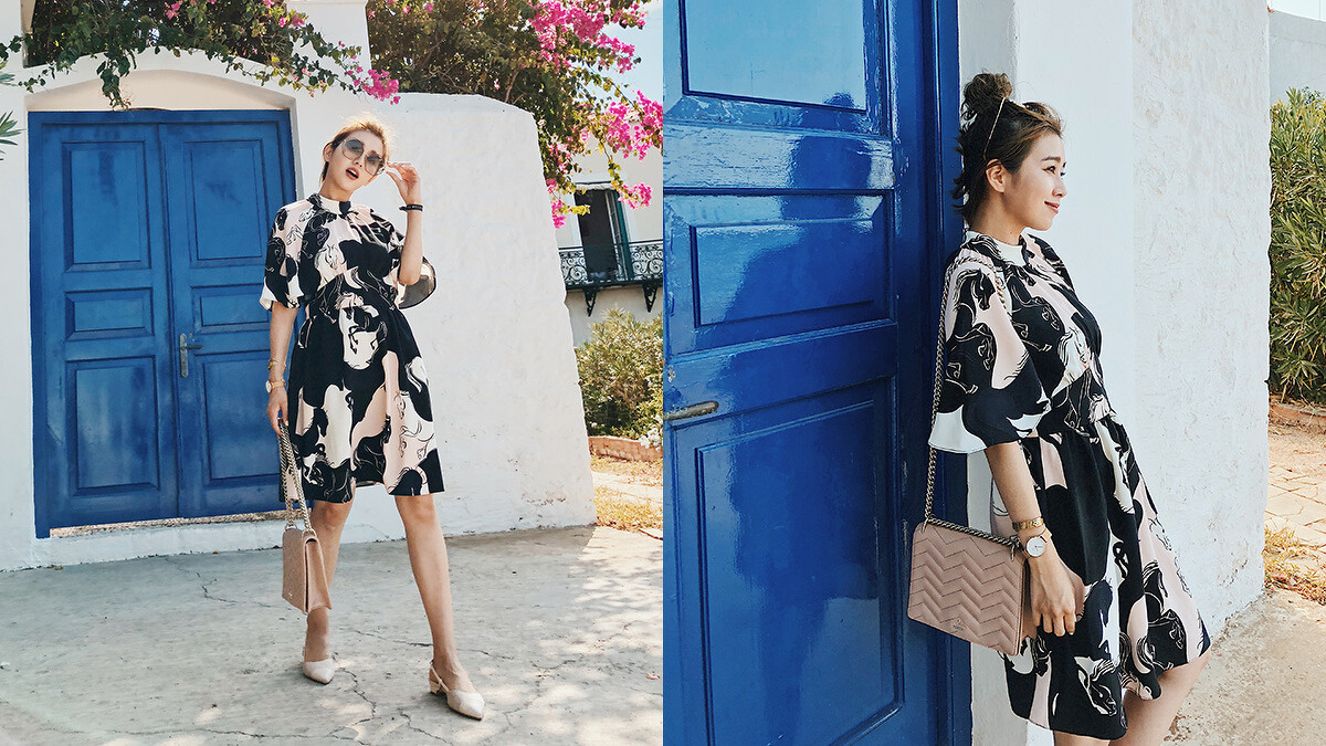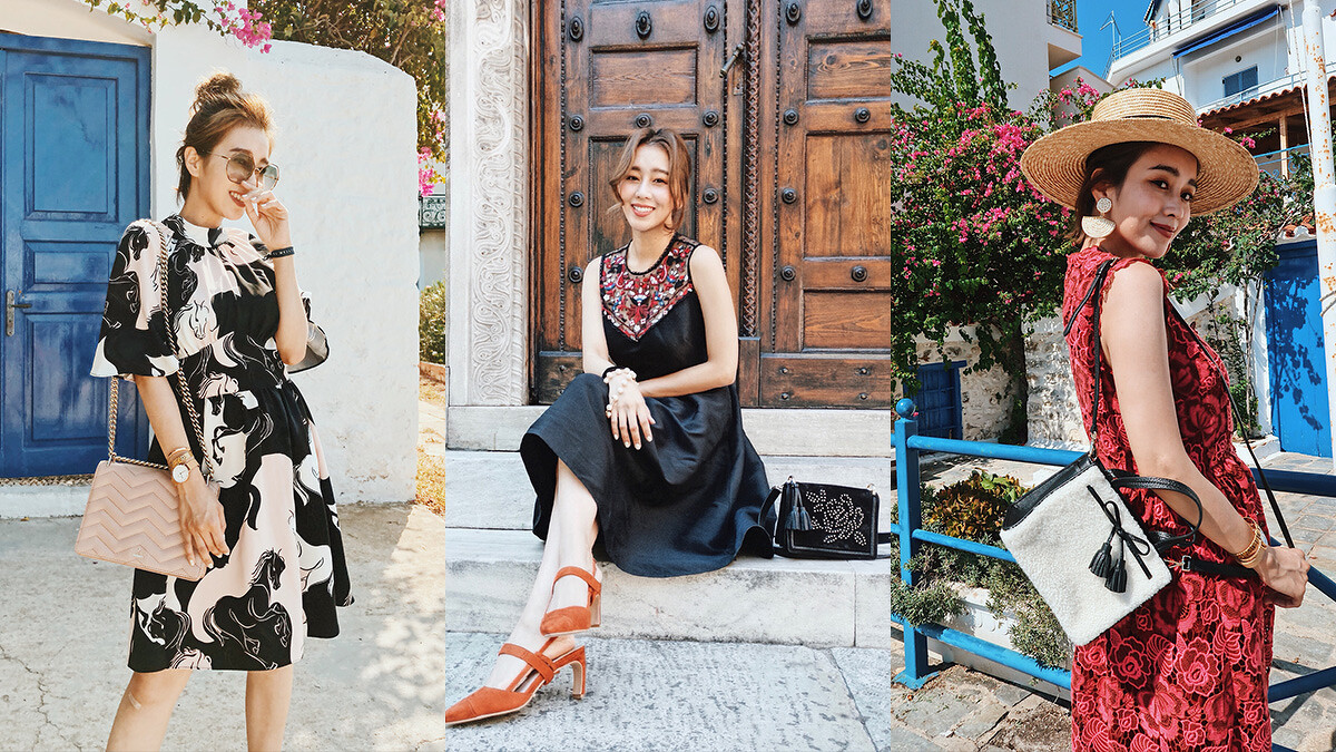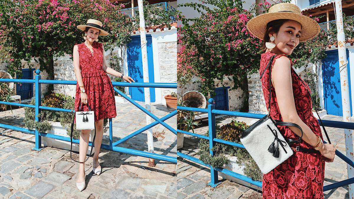 第三套是浪漫的玫瑰刺繡短洋裝,可愛浪漫的風格,這個顏色在希臘就是亮眼呀!加上精緻的刺繡與合而不貼的剪裁,把女孩變女人的小成熟感覺帶出來。搭上白色sam包包,為上季的手鐲手柄sam手袋重新設計,加入絨毛流蘇細節~很可愛呢~