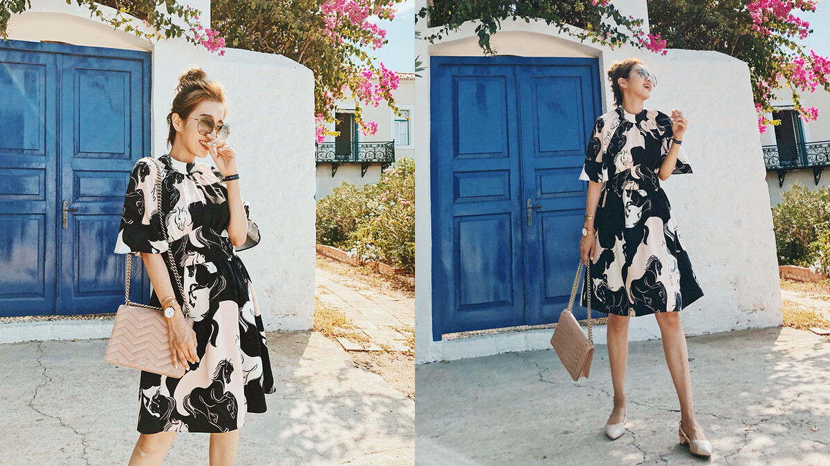 首發的復古版型洋裝,加上可愛的領子配上馬的圖騰,個性又好看,展現大草原的精神,唐葳說這件感覺高個子穿起來也會超好看!粉膚Marci包配搭金屬鏈條肩帶和人字針步縫線,出門約會或上班都好搭喔!