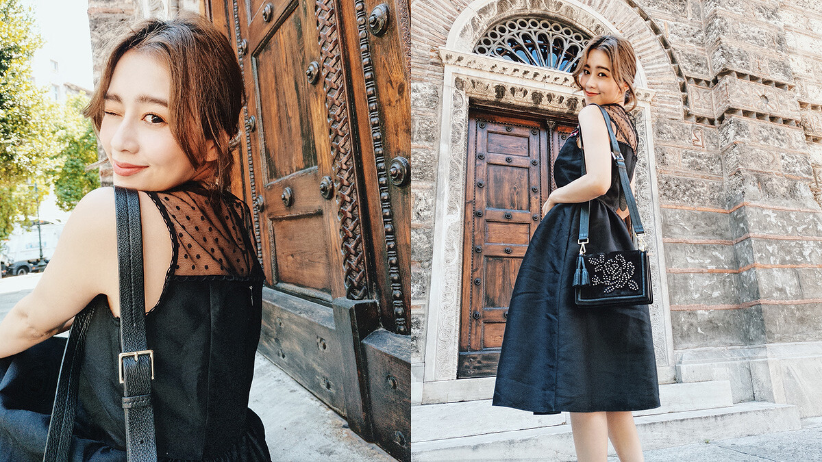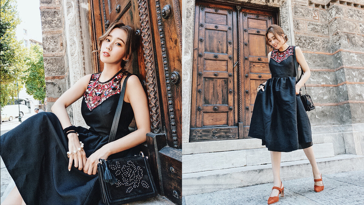 第二套,低調又氣質的黑洋裝,領口透肌的設計蠻美的!前面是花朵樣式、後面是點點~小露性感,很適合去約會的一套!搭配黑色皮革雕花包包,用美國西部草原的率性中和柔美,而唐葳還發揮了小巧思,將珍珠耳環繞成手鍊點綴,帶出時尚復古風。
