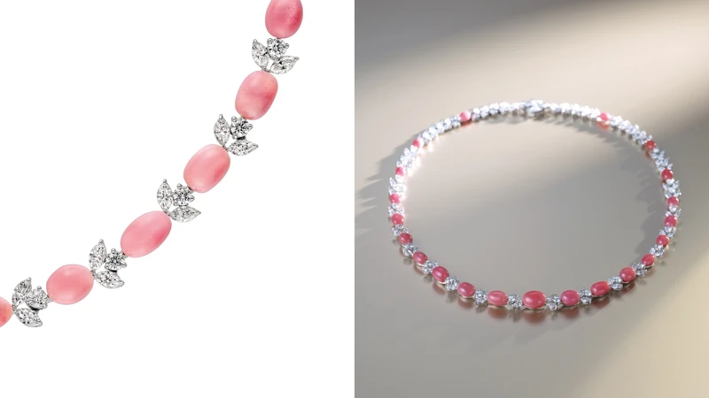 粉紅色澤的珍珠你有看過嗎?來自加勒比亞海灣的孔克珍珠,僅能在每一萬至一萬五千只Queen Conch海螺中發現一顆,稀少的數量加上瓷釉般的火焰紋飾表層,使孔克珍珠成為珍稀典藏,然而,在這僅少的數量裡,僅有十分之一的孔克珍珠可躍升為寶石等級,而這次展覽中一件鑲有21顆孔克珍珠鑽石的項鍊,毅然成為展前討論極高的作品之一。色澤從粉嫩櫻花到飽和鮭粉色,其漸次層遞使作品更匯集了目光焦點!
