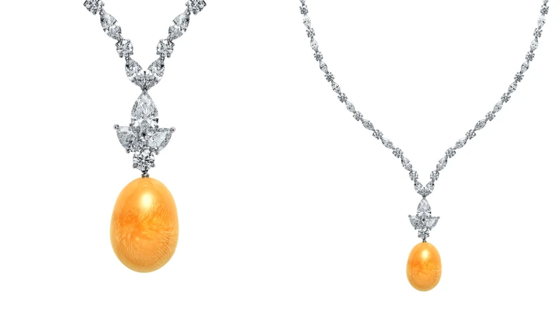 展覽中的另一焦點則是經過五年再度登台的美樂珍珠!來自Melo Melo海螺貝中的美樂珍珠,生長區域在南洋海域及印度至斯里蘭卡間的海灣,產量上雖然沒有孔克珍珠來的稀少,但每七千只Melo Melo海螺貝中僅能發現一顆,使它同樣耀升為珍貴元素。色彩上相較於單一色系的孔克珍珠,美樂珍珠則以明亮彩度的橘、黃、白和少數的紅棕色為主,而此次來展的美樂珍珠則是帶有火焰紋的橘黃色,設計上搭載了美鑽和鉑金鍊,成為典雅又華麗的貴氣珠寶。值得ㄧ提的是,由於Melo Melo海螺貝具有獨特的金黃亮澤,恰好與東方的帝王色彩呼應上,成為祭典樂禮的號角再合適不過,而孕育於中的美樂珍珠則被尊為「龍珠」。