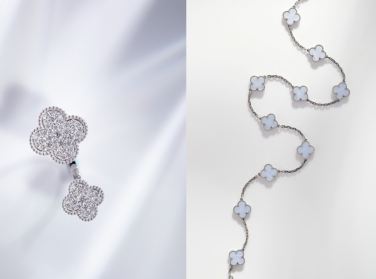 Magic Alhambra指間戒 ,白K金、鑽石;Vintage Alhambra項鍊,10枚墜飾,白K金、藍玉髓