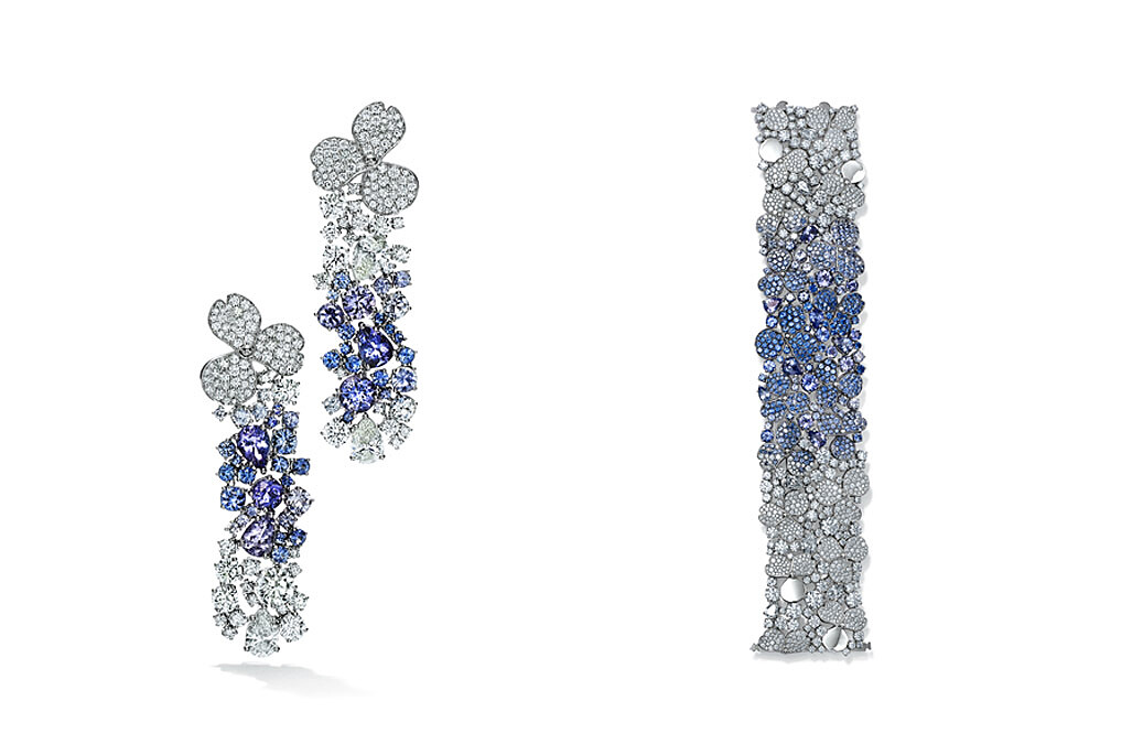 Tiffany Paper Flowers 高級珠寶系列 鉑金鑲嵌丹泉石、藍寶石與鑽石耳環、手鍊