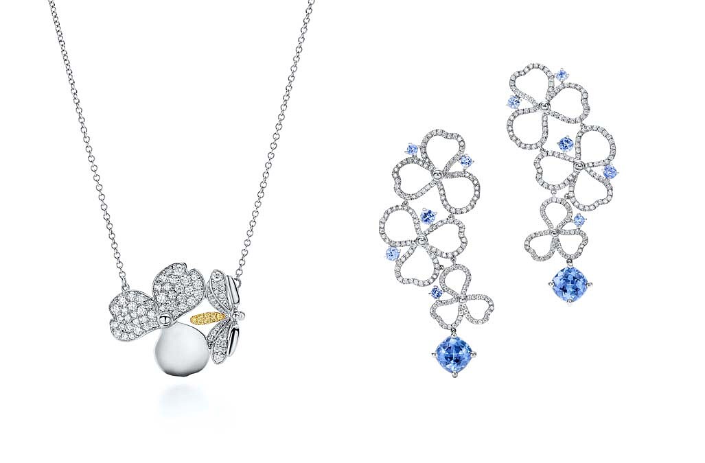 Tiffany Paper Flowers 系列 花瓣與螢火蟲設計鉑金鑲嵌黃鑽與鑽石項鍊、鏤空花瓣設計鉑金鑲嵌鑽石與丹泉石耳環