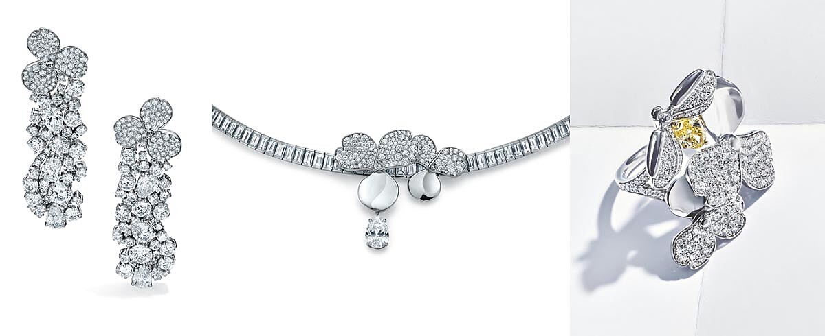 Tiffany Paper Flowers 高級珠寶系列 鉑金鑲嵌鑽石耳環、鉑金鑲嵌鑽石項鍊、花瓣與螢火蟲設計鉑金鑲嵌黃鑽與鑽石戒指