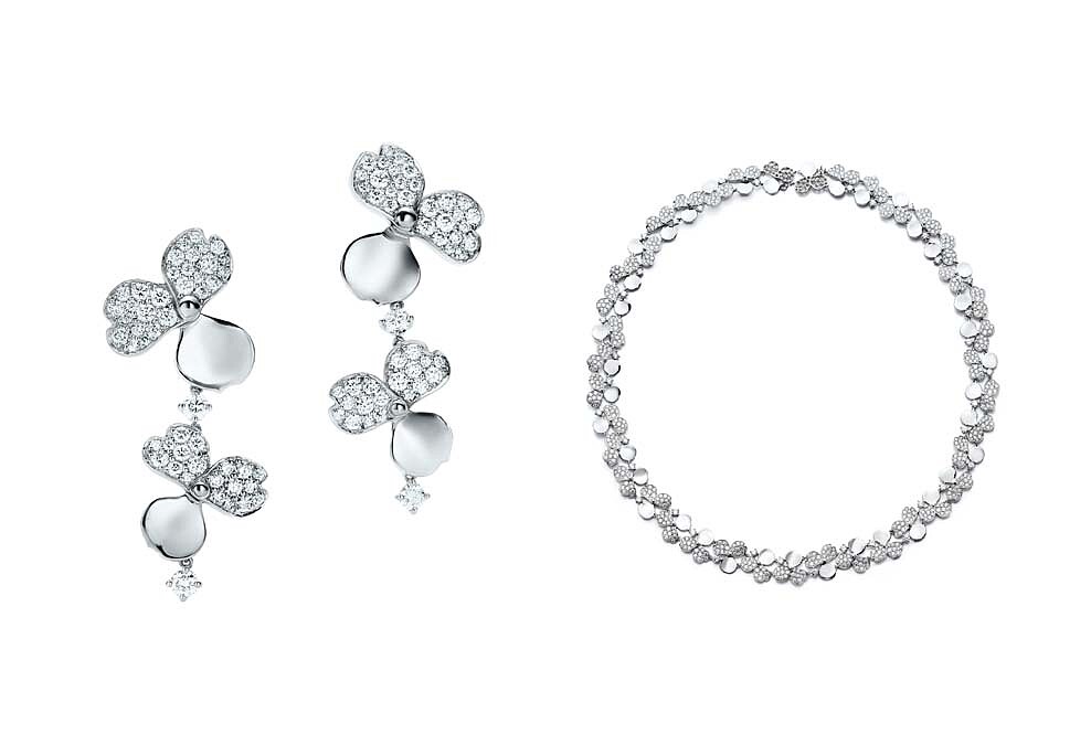 Tiffany Paper Flowers系列 花瓣設計鉑金鑲鑽垂墜耳環、花瓣設計鉑金鑲鑽頸鍊