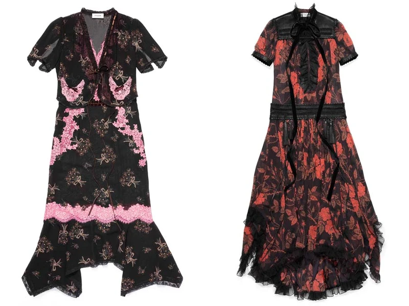 蕾絲印花長裙NT43,800、玫瑰印花圖騰長裙NT57,800