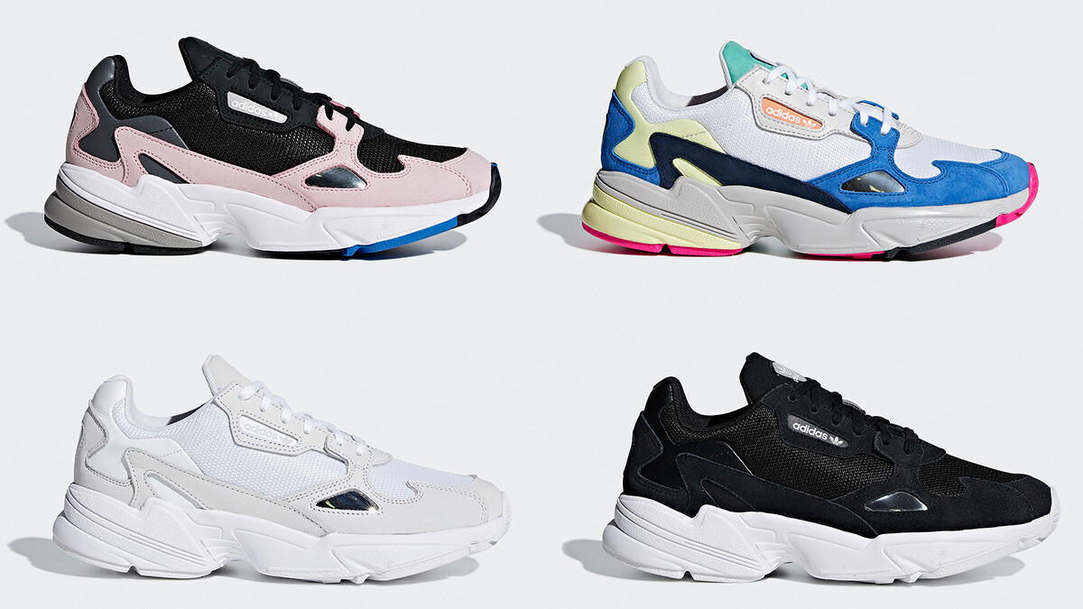 adidas Originals Falcon 黑粉紅配色、彩虹糖果配色、簡約白、時髦黑,皆為NT 3,690元