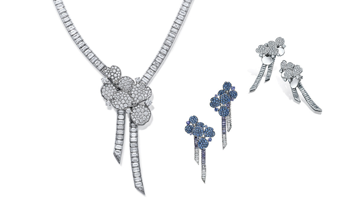 (上圖左至右)Tiffany Paper Flowers 高級珠寶系列 鉑金鑲嵌鑽石項鍊;鉑金鑲嵌丹泉石、藍寶石與鑽石耳環;