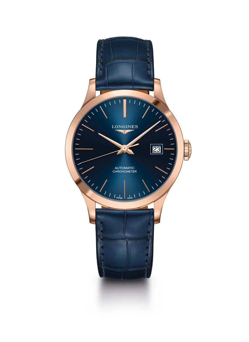 Longines浪琴表Record開創者系列18K玫瑰金藍面腕錶,建議售價NT$200,600