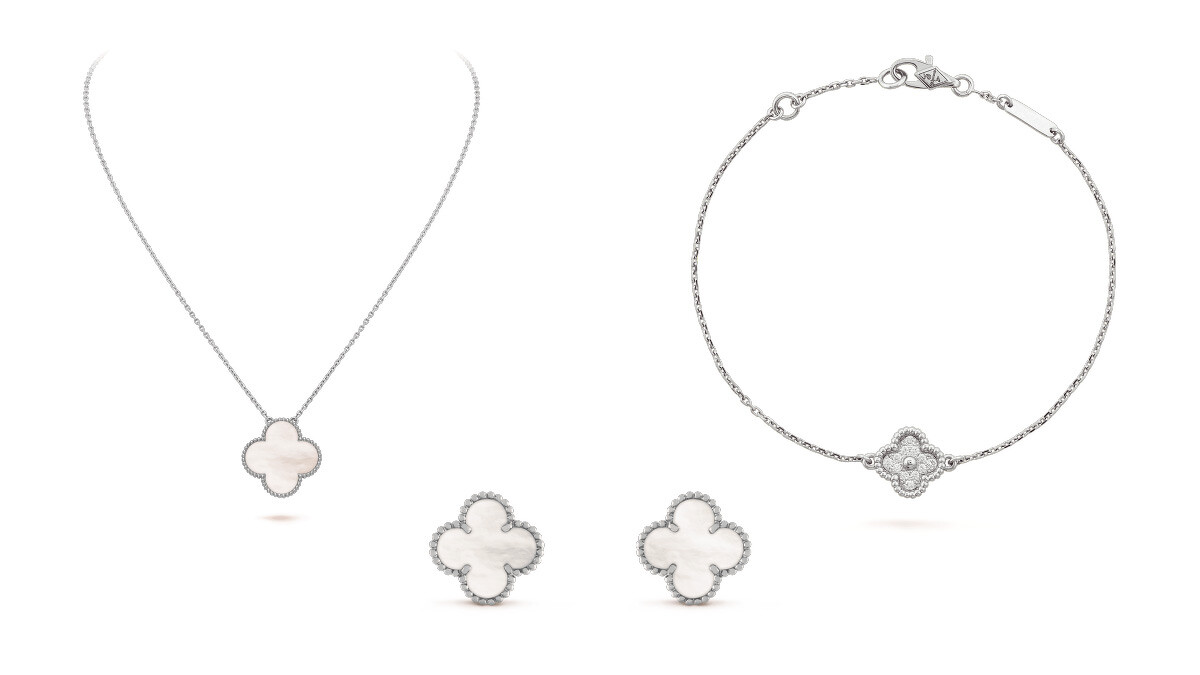 圖片由左至右:Magic Alhambra白K金珍珠母貝吊墜;梵克雅寶Vintage Alhambra白K金白色珍珠母貝耳環;Sweet Alhambra單枚墜飾白K金鑽石手鍊