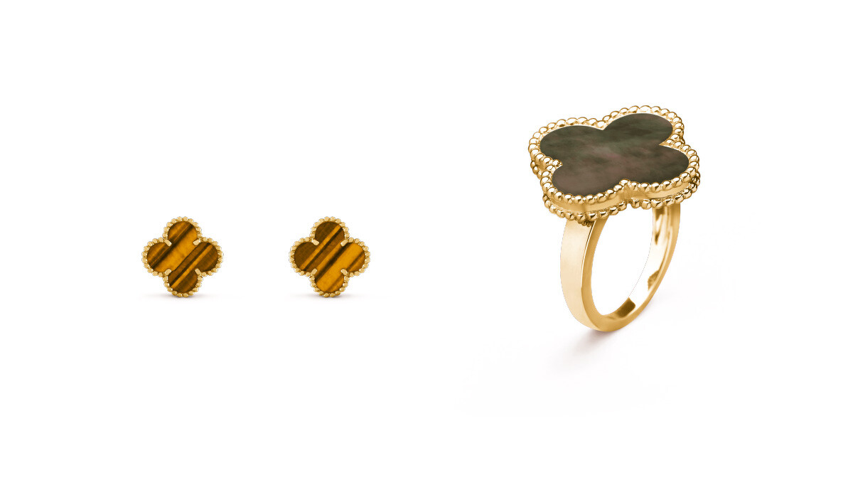 圖片由左至右:梵克雅寶Vintage Alhambra黃K金虎眼石耳環;Magic Alhambra黃K金灰色珍珠母貝戒指。