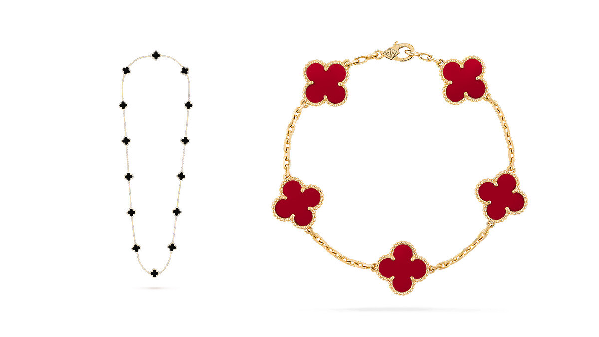 圖片由左至右:梵克雅寶Pure Alhambra黃K金縞瑪瑙長項鍊;Vintage Alhambra黃K金紅玉髓手鍊。