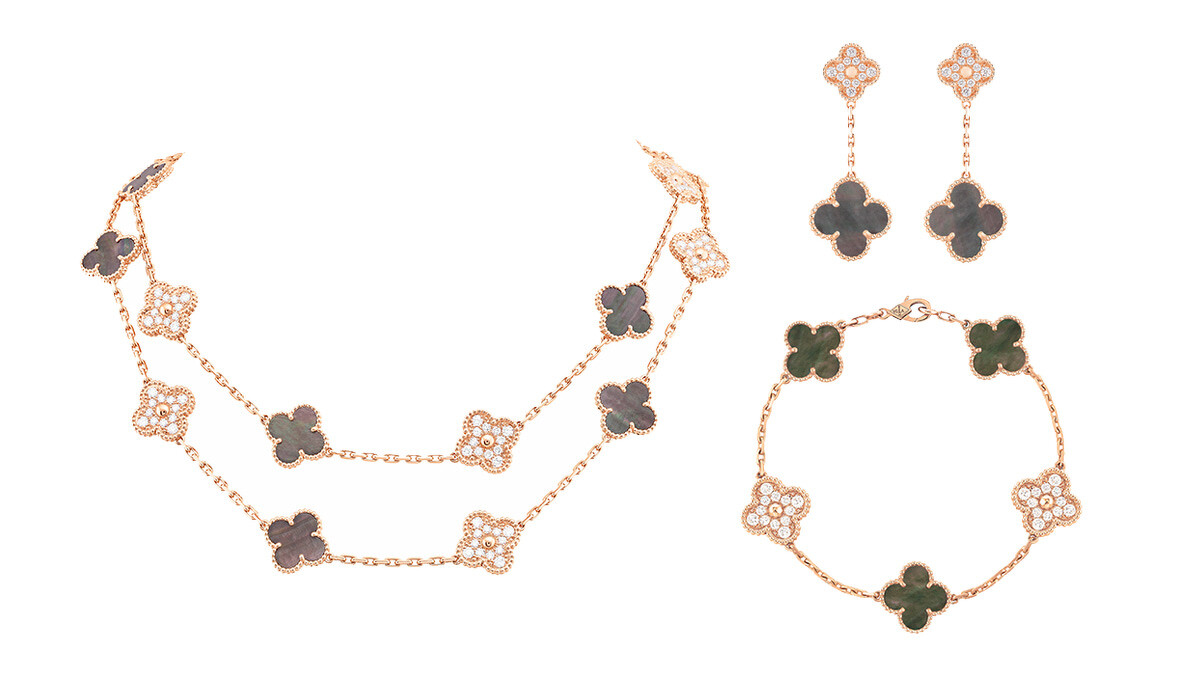 Magic Alhambra灰色珍珠母貝鑽石耳環,Vintage Alhambra灰色珍珠母貝鑽石長項鍊,Vintage Alhambra縞瑪瑙手鍊,Magic Alhambra灰色珍珠母貝吊墜,all by 梵克雅寶。