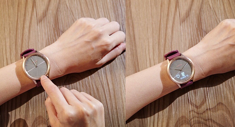和一般科技味濃厚的智慧錶不同,vívomove HR是以時尚的指針式設計,搭配隱藏於錶面的OLED顯示器,只要輕輕敲敲錶面2下,就會在錶面出現智慧型提醒,指針還會很貼心地轉至10點10分,不會遮住顯示的數字資訊~
