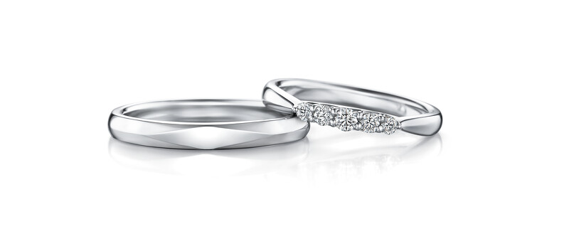 甜蜜的設定組合婚戒,男戒與女戒是規劃成合而為一就會形成優美心型曲線的設計,隱約象徵著戀人心靈之間的默契合拍度,纖細弧線鑲嵌美鑽崁在戒型上,秀氣又討喜,更可以搭配KITALPHA鑽戒做層次組合的套戒配戴。