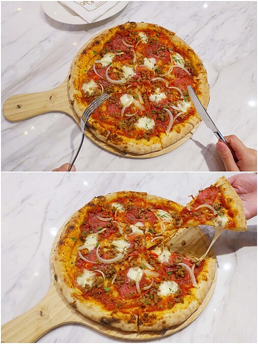 選用老麵發酵製成的餅皮,加上茴香香腸、洋蔥、薩拉米臘腸、新鮮辣椒、新鮮奧勒岡及煙燻莫扎瑞拉起司等多種配料後烘烤,焦香口感、富有嚼勁的老麵風味,是熱愛披薩的消費者絕對必嚐餐點!