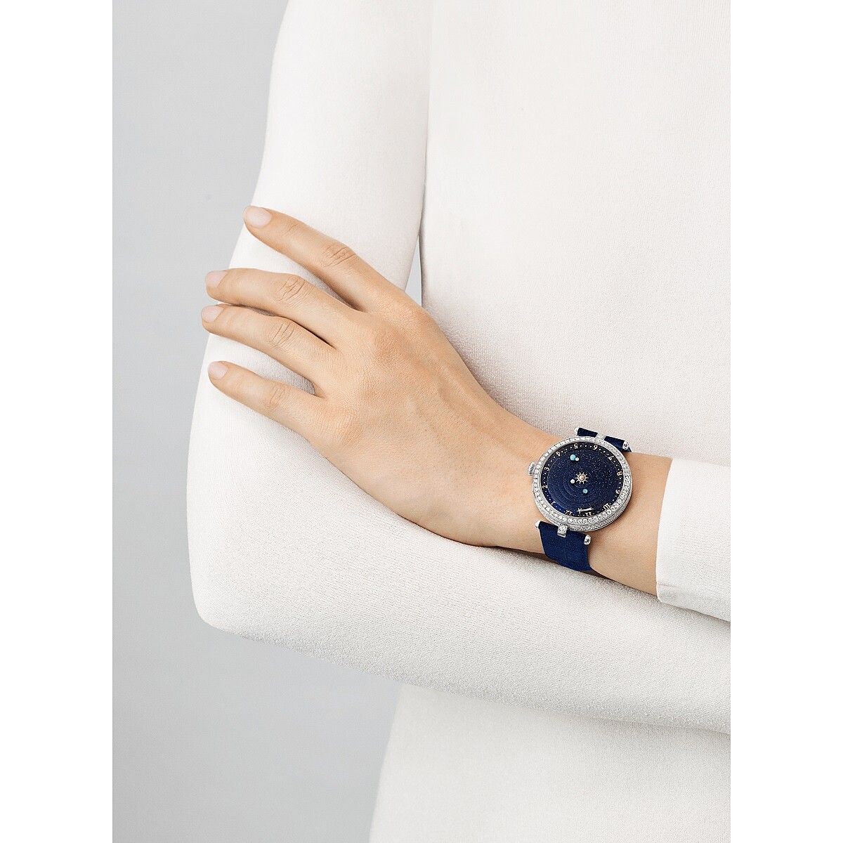 ↑模特兒佩戴Lady Arpels Planétarium詩意複雜功能腕錶(閃耀藍色鱷魚皮錶帶)