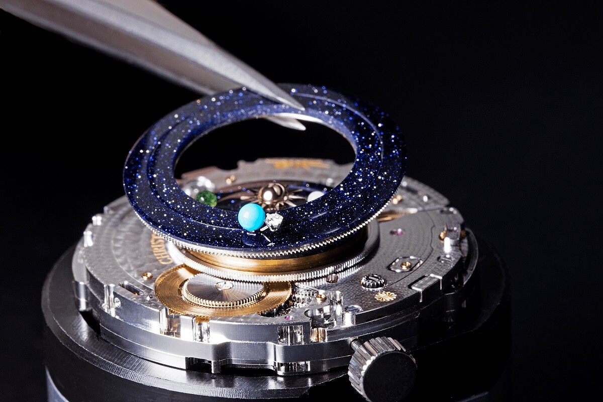 ↑為呈現宇宙穹蒼的浩瀚無垠,世家以精湛工藝將立體概念融入設計之中,七個砂金石轉盤以同心環方式裝嵌於Lady Arpels Planétarium錶款的錶盤,與腕錶機芯獨立運行,錶盤上的粉紅珍珠母貝水星、綠松石地球和綠色琺瑯圓珠金星等星體,也各自以其真實速度環繞中央的玫瑰金太陽轉動著。