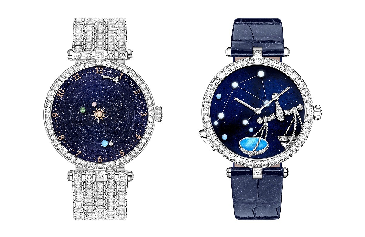 ↑左為Lady Arpels Planétarium詩意複雜功能腕錶(鑲鑽白K金錶帶)/右為Lady Arpels Zodiac Lumineux腕錶(天秤座)