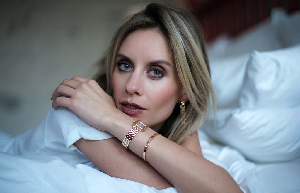 德國時尚生活部落客Lisa Hahnbück以日常的白T搭配Panthère de Cartier玫瑰金錶款與Love系列手鐲,自在隨性。Photo/ Instagram@lisahahnbueck