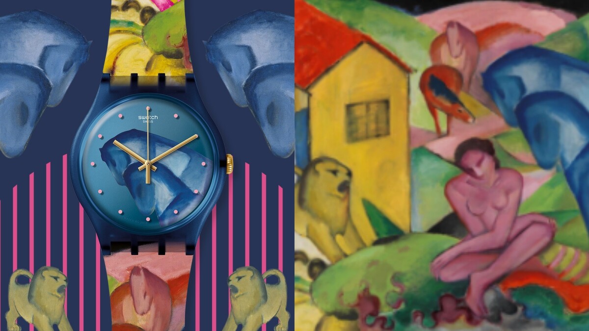 人與動物間的和諧共生,在20世紀表現主義藝術家法蘭茲.馬克的畫作上完美呈現。以獨特的透視手法和色彩規則,重新解構萬物中的美好景象,同時也訴說著當時對世界和平的期望。腕錶設計上,Swatch將沉穩的藍色點綴於錶面,象徵外顯威武的陽剛氣息,相比之下,錶帶上溫和的黃紅色調則代表著柔美敏銳的內在特質。