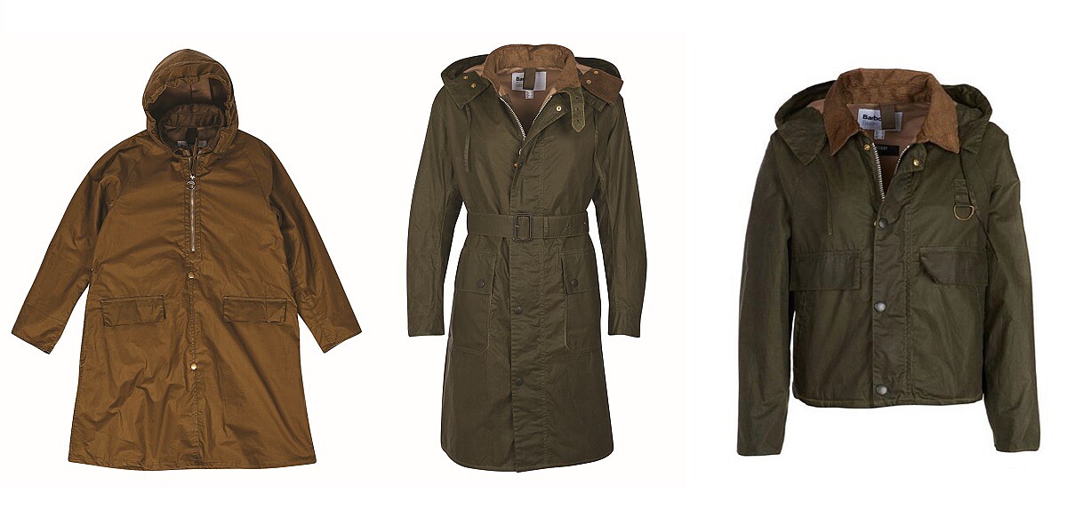 左至右:Barbour Margaret Howell Wax Poncho、Barbour Margaret Howell Ursula Waxed Cotton Jacket、Barbour Margaret Howell Spey Waxed Cotton Jacket,價格店洽。