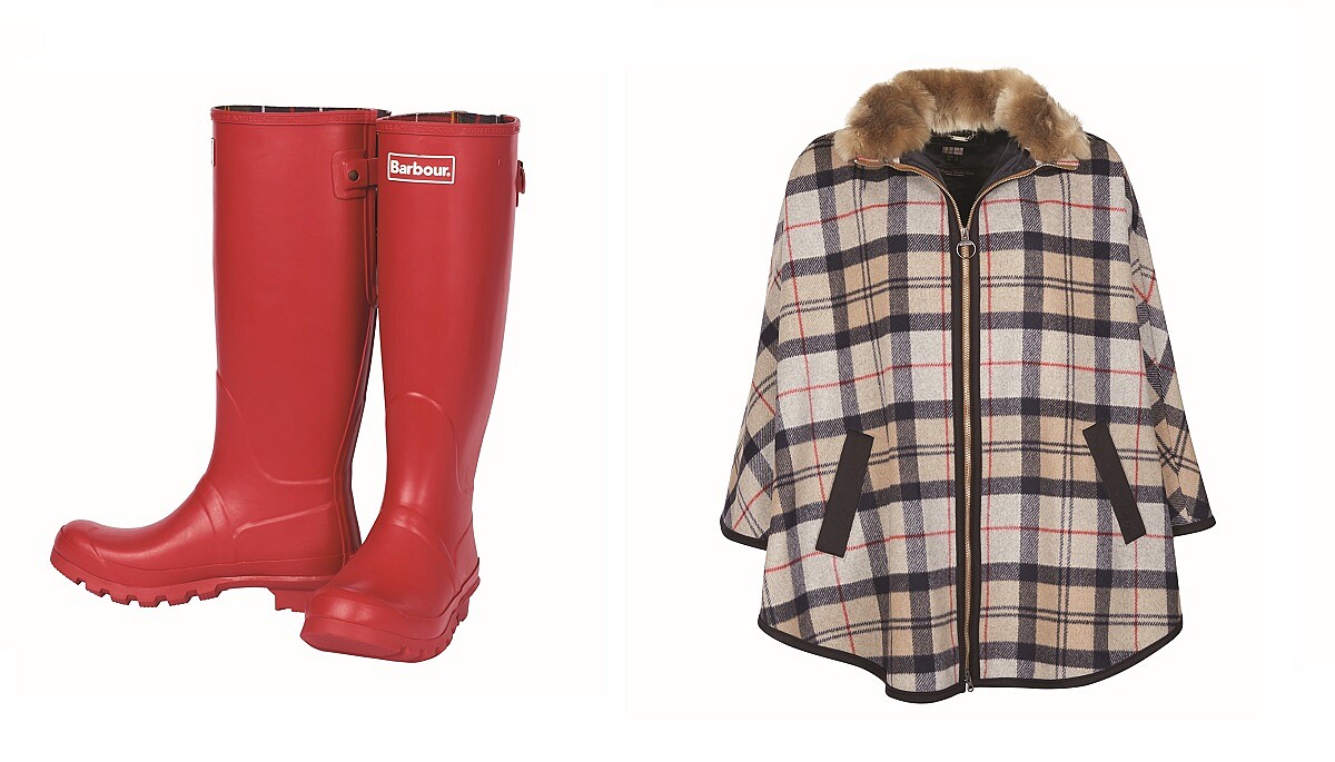 左至右:Barbour Jarrow 長筒雨靴、Barbour 格紋毛呢拼接斗篷