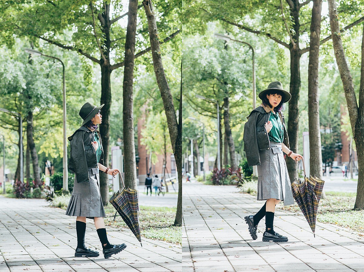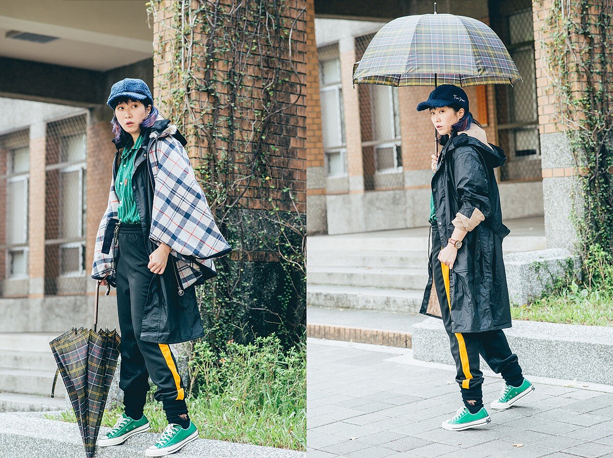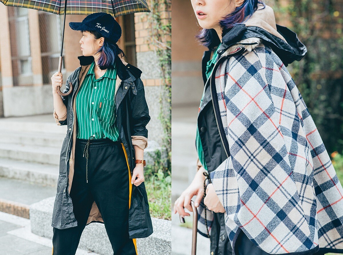 選擇Barbour Margaret Howell Ursula Waxed Cotton Jacket作為搭配主角,內搭復古條紋襯衫、束口邊條褲,整體色調是以綠黑黃的鮮明對比讓造型感更為強烈,讓風格更為貼近傳統式英倫學院氛圍,但又從中結合了運動街頭元素,使得時髦效果更加突出;如果天氣再更為寒冷的話,外罩Barbour毛呢格紋斗篷,不僅保暖度倍增,營造出的層次感也能讓秋冬造型顯得經典又出色。
