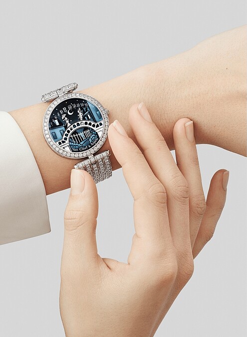 這場超級有看頭的鐘錶展,更有其他非傳統時間指示的設計,「Lady Arpels Pont des Amoureux」戀人之橋腕錶,以在巴黎鐵塔和聖母院相對望的一對戀人為設計,面盤左側的女孩與右側的男孩,則是各自以逆跳功能來指示小時與分鐘,兩人在每天的正午與午夜會靠近對方,相遇親吻。「Lady Arpels Féerie」腕錶以逆跳機芯讓閱讀時間更賞心悅目,在半透明藍色琺瑯背景的襯托下,仙子的魔法棒指示小時,而羽翼則指示分鐘。
