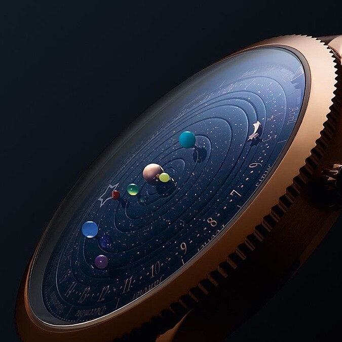 天文星宿與時間向來是有著密不可分的關係,曾被品牌全球總裁暨首席執行官Nicolas Bos形容為夢想與科學的相遇,「Midnight Planétarium Poetic Complication」男錶以及「Lady Arpels Planetarium」女錶,可是誠意十足把整座太陽系都微縮於錶盤上,是結合天文學概念與機械學理的夢幻作品:面盤底層的砂金玻璃錶盤是天空的意象,同心圓最中心的小金球則是象徵太陽,其它的寶石小球各自代表不同的星球,更以各自獨立的齒輪來連動運轉,以呈現出真實天象,也就是說錶盤上的迷你地球要花上一年才會轉完手錶一整圈!如何閱讀時間呢?同心圓最外側的流星來指示,另外,手錶還有個可愛的「自選的幸運日」功能,只要直接旋轉錶圈設定紅色三角形指示的日期,當那一天來臨的時候,鏡面玻璃上的空心星星圖騰會剛好在地球正上方。