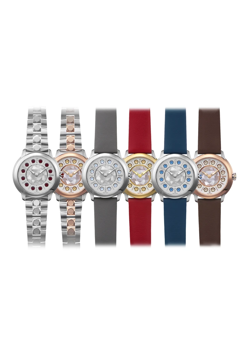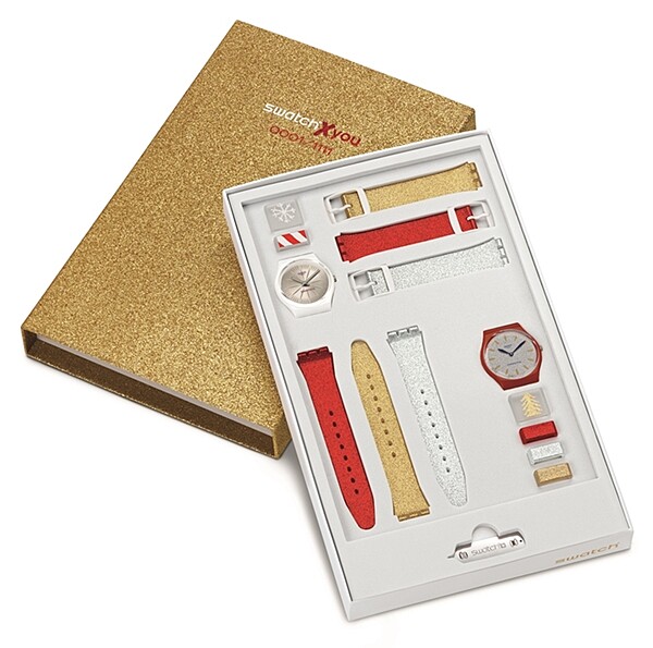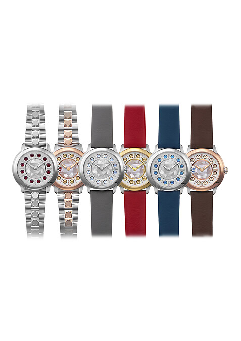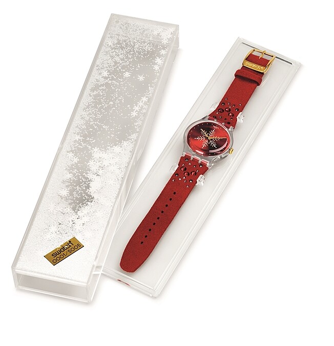 全球限量5,005只的佳節限定「紅色耶誕」錶款,錶盤上裝飾閃耀水晶與放射雪花圖案,紅色合成麂皮鑲有彩色水晶,替冬日帶來暖心幸福的美好時刻,售價台幣$3950。另有全球限量1,111組的紅色、霧金、霧銀三色錶帶、錶頭與錶環,每天隨心所欲變化造型,怎麼戴都有型!