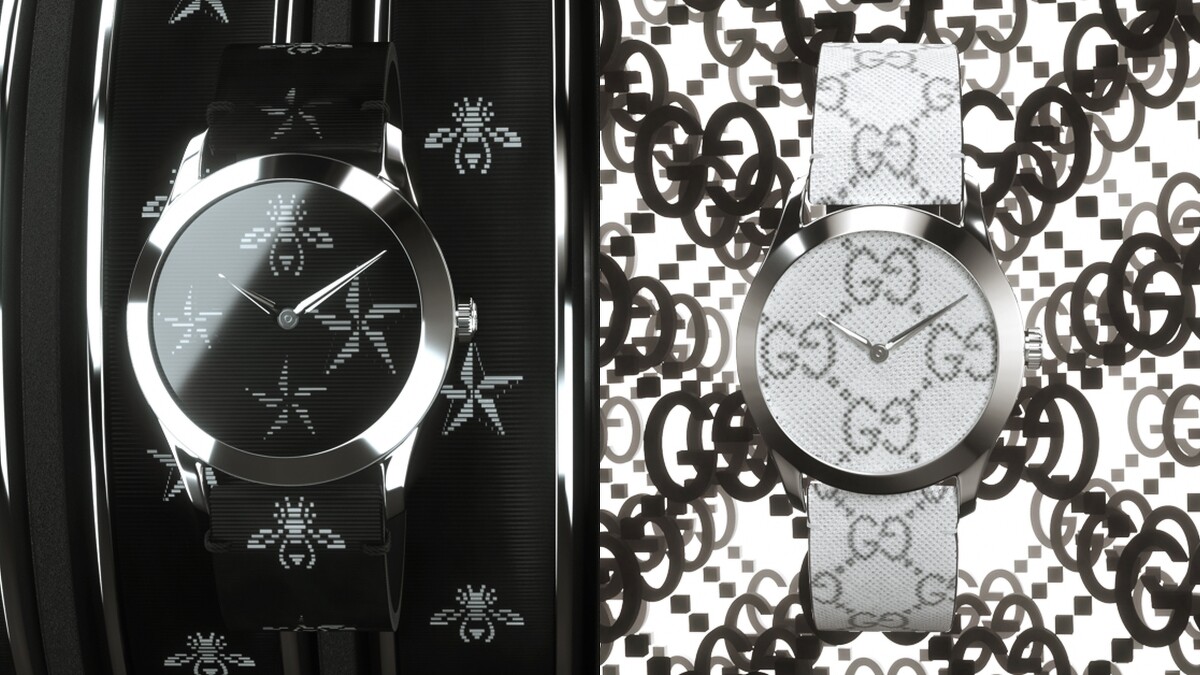 新款為錶徑尺寸38毫米的石英錶款。最顯眼之處在於以浮空影像的立體效果呈現Gucci標誌性的圖案,經典、有趣又饒富未來感!黑色錶款則運用蜜蜂與星星圖案,以立體浮空效果呈現生動振翅的圖象。銀白色的雙G圖案錶款後底蓋則鐫刻珠寶系列中亦可見到的Ouroboros(銜尾蛇)圖案。