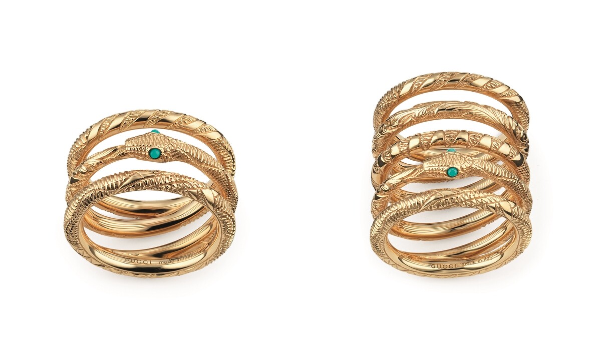 靈感源自古埃及符號,描繪蛇吞食自己尾巴的形象,象徵生命的不息與滾滾而來的財富。全系列包含兩款不同寬度的多環戒及單環戒,皆以18K黃金打造。單環戒指另外提供土耳其石蛇眼的素面黃金款及鑲鑽款。蛇形戒指項鍊和墜飾更可單獨配戴或結合Gucci吊飾,凸顯個人風格。其中三款將鮮明的寶石圓珠(綠松石、珍珠、瑪瑙、珊瑚、縞瑪瑙和紅玉髓)串連成蛇紋圖案,另兩款則以復古質感的手工拋光純銀材質閃爍微光。
