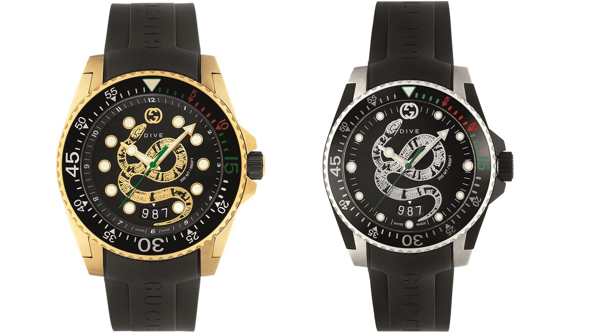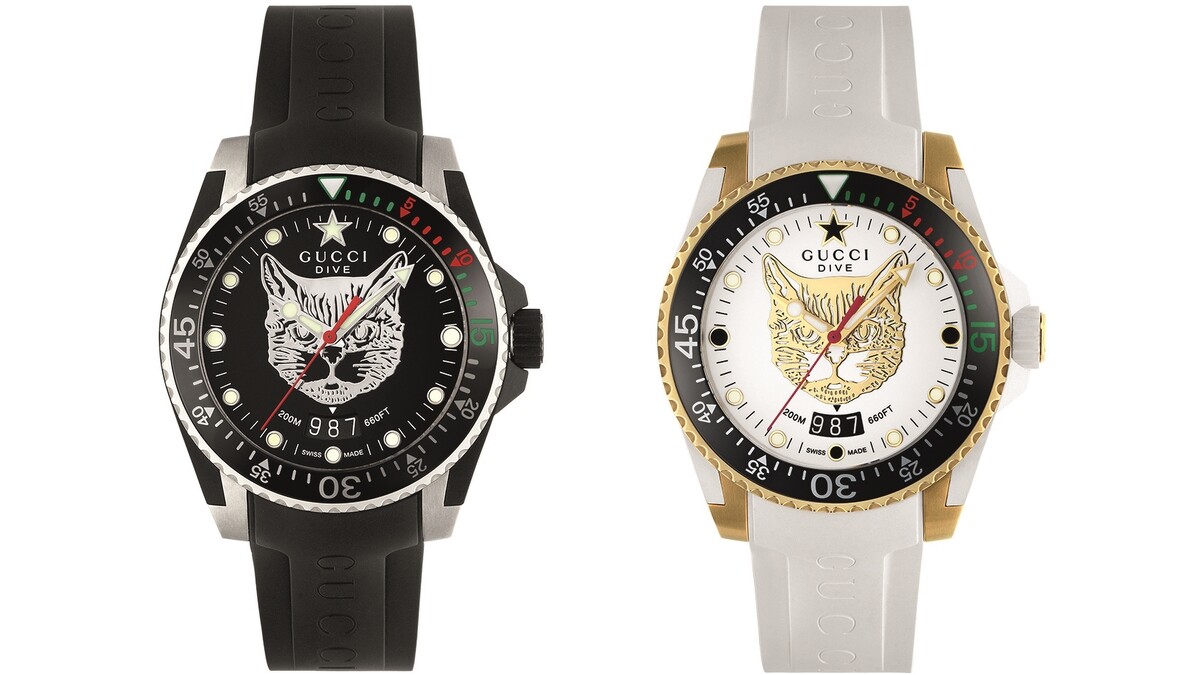 Dive系列以貓科動物或帝王蛇為主要面盤設計主題,視覺效果超搶眼,並結合了單向旋轉錶圈的潛水錶經典元素,打造Gucci專屬的時髦運動錶。系列再細分為兩種尺寸:45毫米腕錶推出黃金PVD錶殼或不鏽鋼配黑色橡膠錶帶款式,錶面則飾以金或銀色帝王蛇圖案,與錶殼色調相互映襯。另兩款40毫米腕錶的錶面則是萌翻的貓咪動物圖案,有白或黑色、不鏽鋼錶殼搭配黑色錶面與黑色橡膠錶帶、黃金PVD錶殼配白色錶面和白色橡膠錶帶的變化款式。還有夜光功能,讓貓咪圖案更顯有趣。