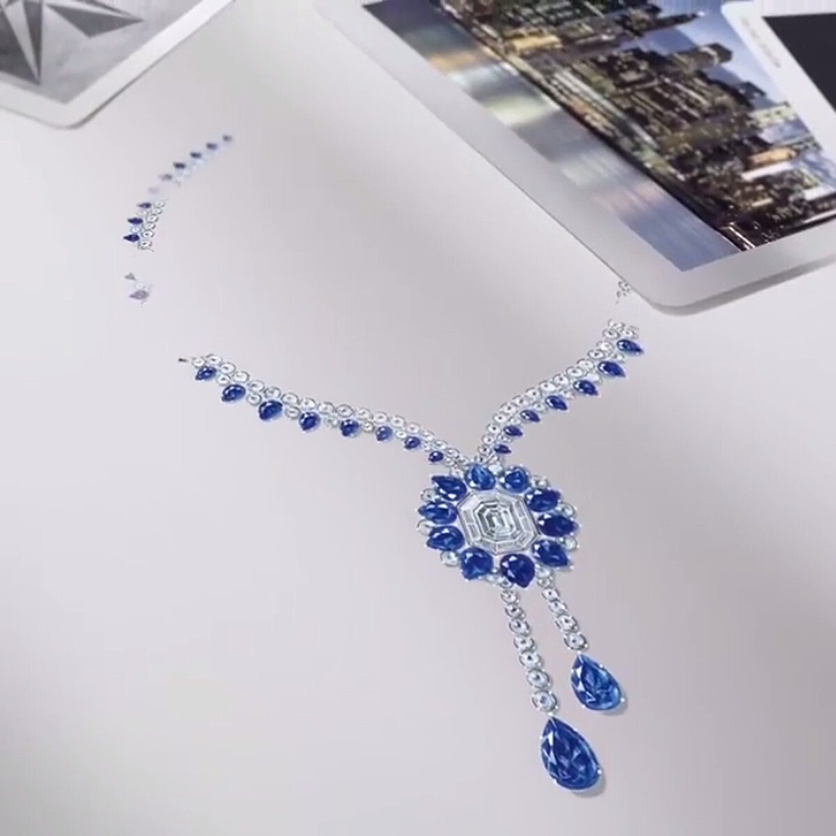 718 Marble Marquetry包含一系列以鑽石和藍寶石交織而成的項鍊、耳環及戒指,設計靈感源自海瑞溫斯頓工坊的大理石放射狀設計。