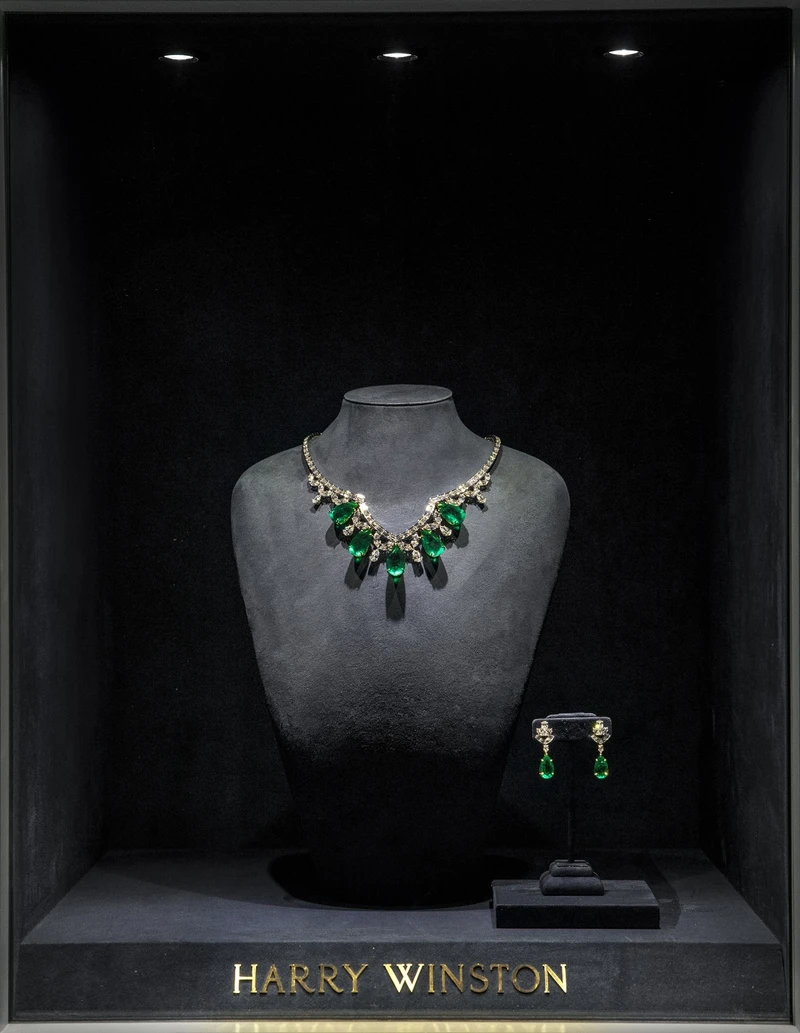 718 Emerald Vitrine作品以哥倫比亞祖母綠搭配長形切工、馬眼型切工及圓形明亮式切工鑽石,呼應海瑞溫斯頓先生鍾愛的鑽石切工,以及旗艦店外牆排列的七扇鍍金質櫥窗。
