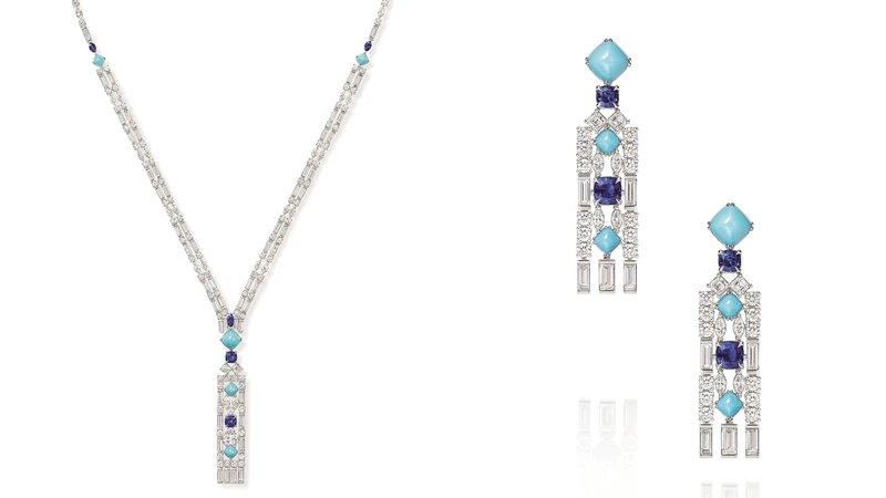 作品靈感取自海瑞溫斯頓先生出生地—紐約上西城的赤褐色砂石建築。長形切工、圓形明亮式切工及馬眼型切工鑽石,綴以色彩繽紛的方形切工寶石,巧妙排列成幾何圖案。此系列有長項鍊及配套耳環,備有兩種顏色寶石搭配選擇,包括Sugar-loaf Cut綠松石搭配藍寶石,以及藍與黃色藍寶石組合。