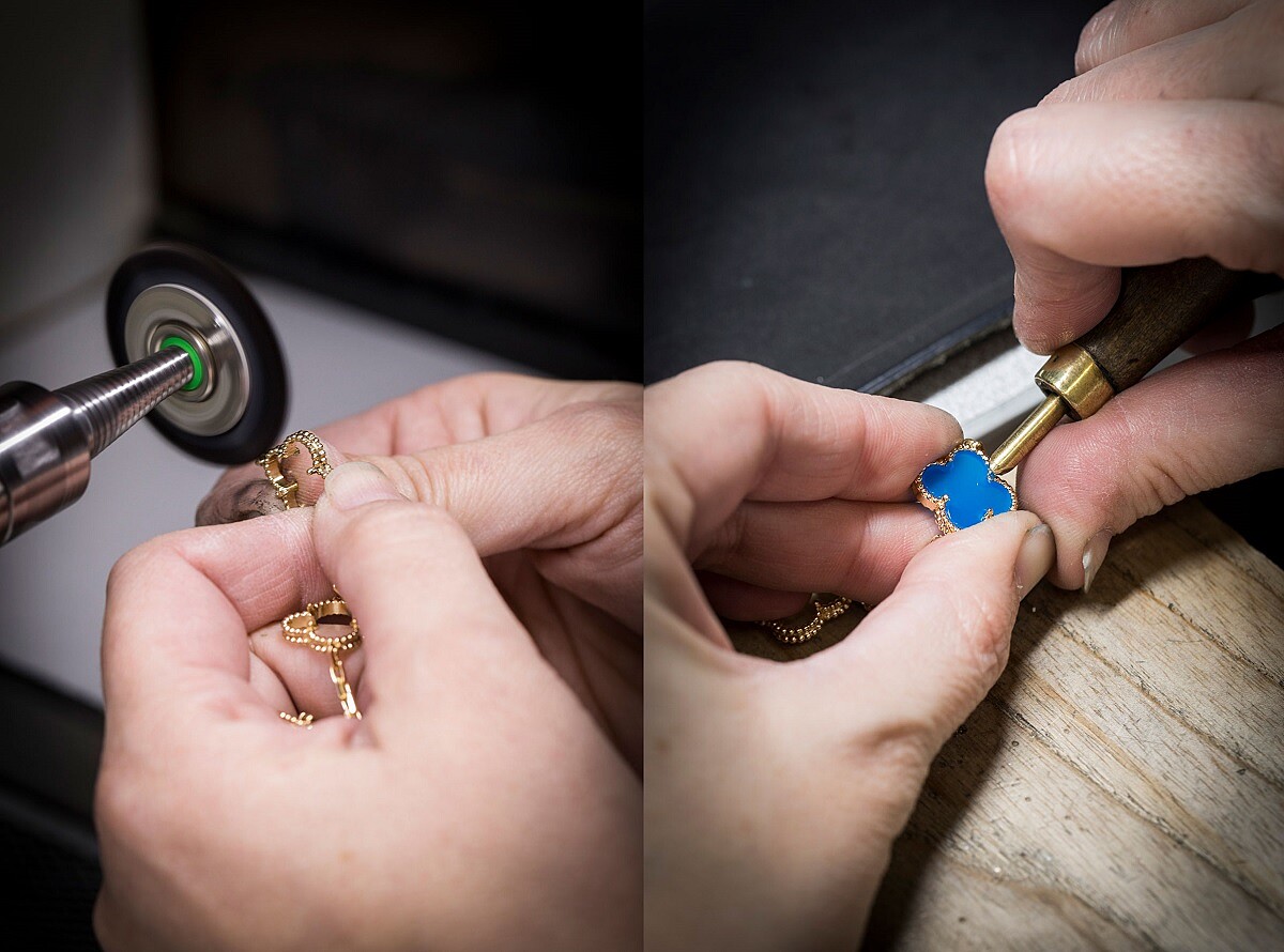 追求極致與優雅的珠寶世家梵克雅寶,對於製作Vintage Alhambra系列的金屬工藝也十分講究,在四葉幸運草葉瓣邊緣裝飾了和Perlée系列一樣的金珠,經繁複的金工工序後再鑲嵌上彩色的天然寶石,小巧細緻的模樣更讓人愛不釋手。