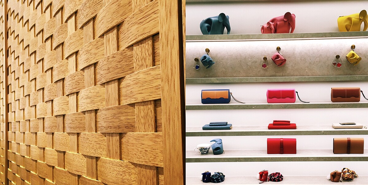 LOEWE創意總監Jonathan Anderson 將CASA LOEWE馬德里概念店完整呈現於新光三越台中中港店,店面寬敞並以灰泥牆和西班牙萊母石地板為主調和灰色手工編織羊毛地毯,以及編織方式呈現的木質牆面,營造出別緻溫暖的家居感。