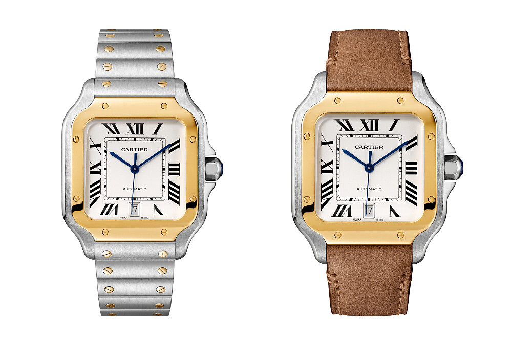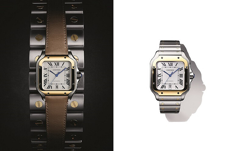 Santos de Cartier腕錶精鋼錶殼,QuickSwitch可更換式錶鍊(附小牛皮錶帶);Santos de Cartier黃K金及精鋼錶殼腕錶,大型款。