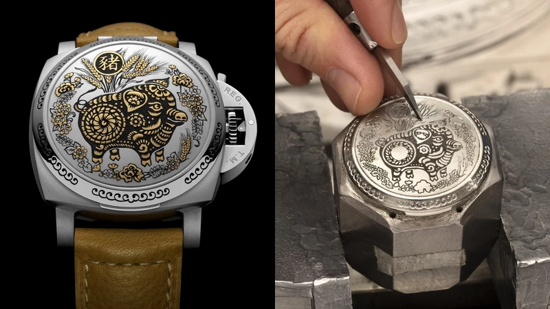 超萌!沛納海Panerai推出Luminor Sealand錶徑44毫米的豬年腕錶,全球僅限量88只,最大的特色便是錶盤上蓋的小豬圖案,以意大利古老工藝「SPARSELLO」雕琢而成同時加上金線嵌花,有點古意又不失俏皮,讓小豬圖案與中文字體的呈現更耐看。Luminor Sealand系列是沛納海自2009年開始以12生肖為主題所推出的作品,新款腕錶是同系列第十一款型號。