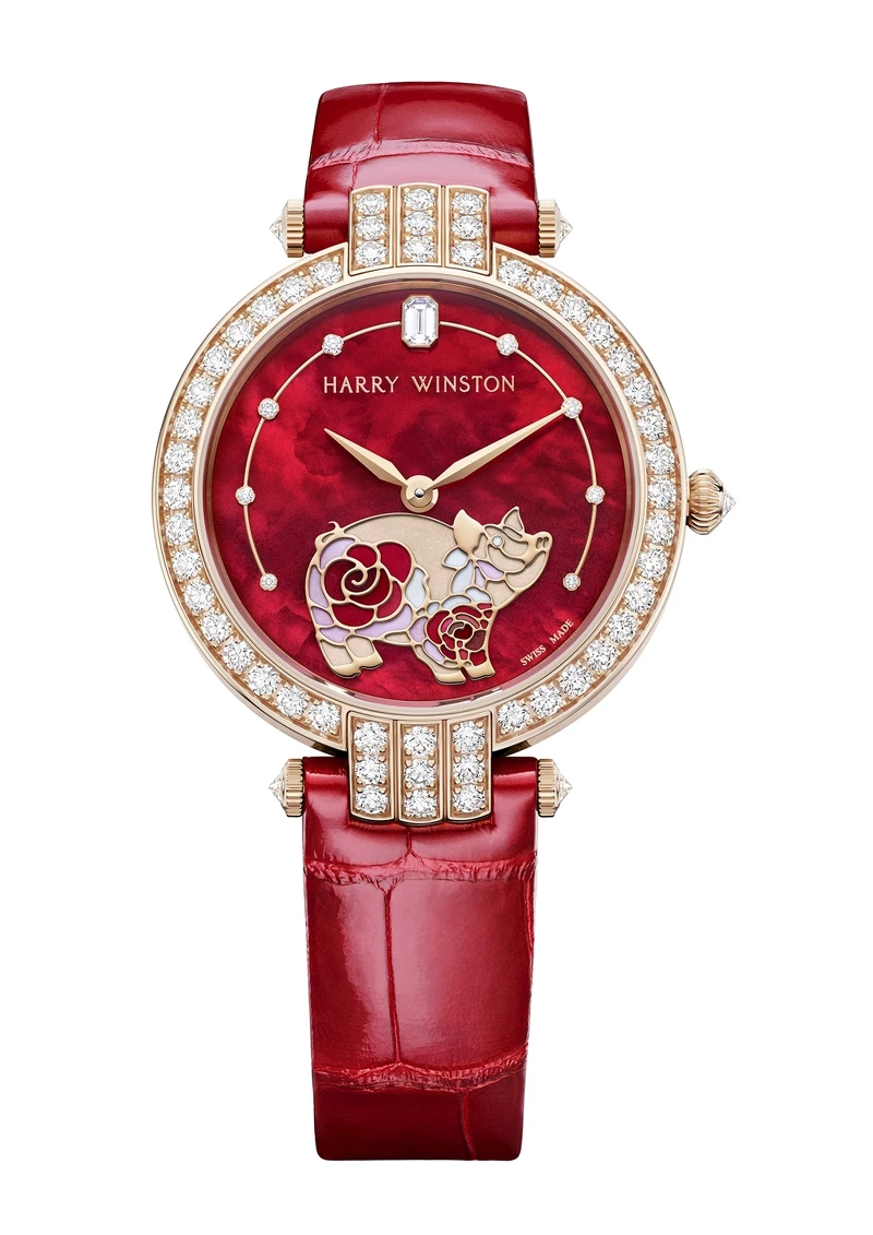Harry Winston為品牌最具識別的Premier 系列腕錶,換上了豬年主題的可愛面盤設計。亮紅色背景襯著玫瑰金材質勾勒而來的可愛小豬,小豬身體還以珍珠母貝拼貼出荷花玉蘭圖案,精緻有型。