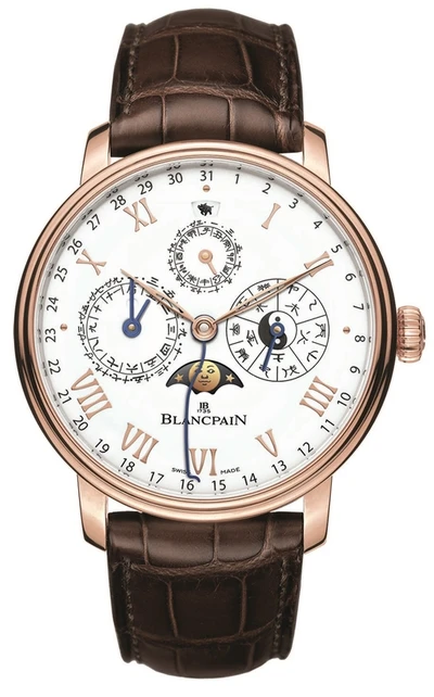 相較於其他鐘錶品牌把小豬圖案直接置於面盤上,寶珀則是選擇將中華曆法呈現於錶盤的設計巧思來呈現,農曆月份含閏月與日期顯示,配製在腕錶的9點鐘方向;五行元素和十個天干則安排於腕錶的3點鐘方向;陽曆的日期則透過藍色蛇行指針與外圈數字軸來指示;12點鐘位置的視窗顯示當年所屬生肖,一隻討喜而精神抖擻的小豬立於12點鐘位置,寓意2019豬年呈祥,下方有十二時辰的指示。