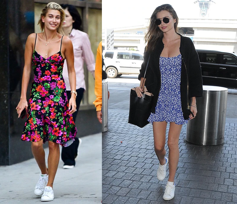 小賈斯汀的老婆Hailey Badwin(左圖)與Miranda Kerr(右圖)不約而同以繽紛洋裝搭配Stan Smith,用純白鞋身增加全身亮點,穿出年輕妹子專屬的活潑俏麗氣息,Girly but young!